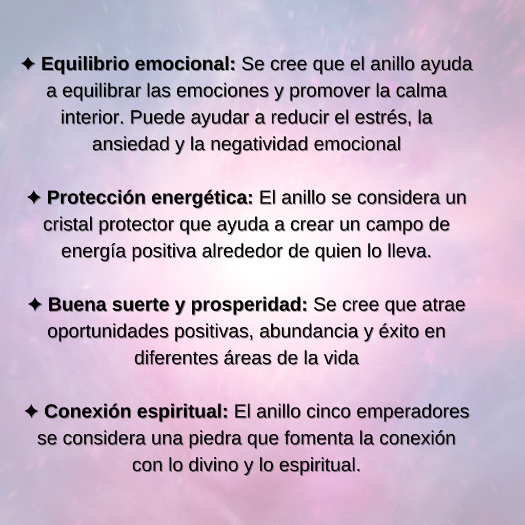 Este anillo de edición limitada fusiona los símbolos de los 5 Emperadores en un diseño ajustable y elegante. Forjado con precisión, este accesorio es más que una joya; es una conexión directa con el legado de la abundancia y la riqueza.